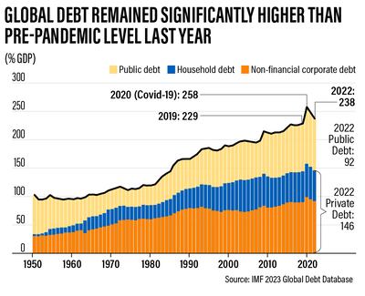 Total debt stood at 238 per cent of global gross domestic product last year, nine percentage points higher than in 2019, the report said.