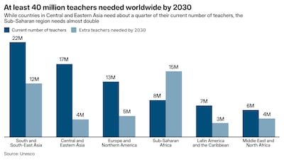 More than 40 million new teachers will be needed worldwide by 2030 to meet growing demand, Unesco warns. The gap is sharpest in Sub-Saharan Africa, where almost double the current number of teachers will be required. Europe and North America face smaller gaps, but still need millions of new educators to keep standards from slipping.