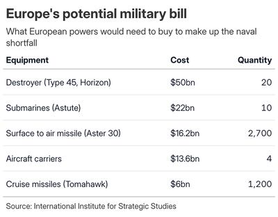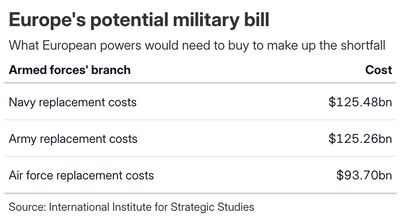Removing American might from the European equation raises queries over how much dozens of countries can invest to match the level of military readiness on offer today. The cost for Europe's defence in the event of a US military withdrawal following a Ukraine peace deal would be $1 trillion, according to a think tank.