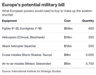 This new air armada would cost up to $64 billion but Europe would also need other aircraft currently supplied by the US, including 15 P-8 Poseidon submarine hunters ($4.8 billion) and 200 attack helicopters, such as the Apache ($12 billion).