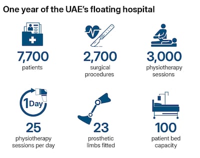 The UAE floating hospital in Al Arish, Egypt, near the Gaza border, has provided treatment for 7,700 patients, carried out more than 2,700 surgical procedures, held at least 3,000 physiotherapy sessions and fitted 23 prosthetic limbs in the past 12 months.