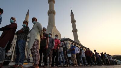 People queue outside Al Farooq Mosque in Dubai before sunset, waiting to break their fast. EPA -