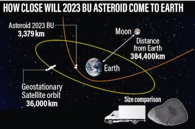 The 2023 BU asteroid will come so close that its path around the Sun is expected to be significantly altered, Nasa said. Any asteroid in Earth’s proximity can change trajectory due to Earth’s gravity.