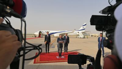 Israeli National Security Adviser Meir Ben-Shabbat, centre, and US National Security Adviser Robert O'Brien, on the tarmac after disembarking from the El Al flight. Victor Besa / The National -